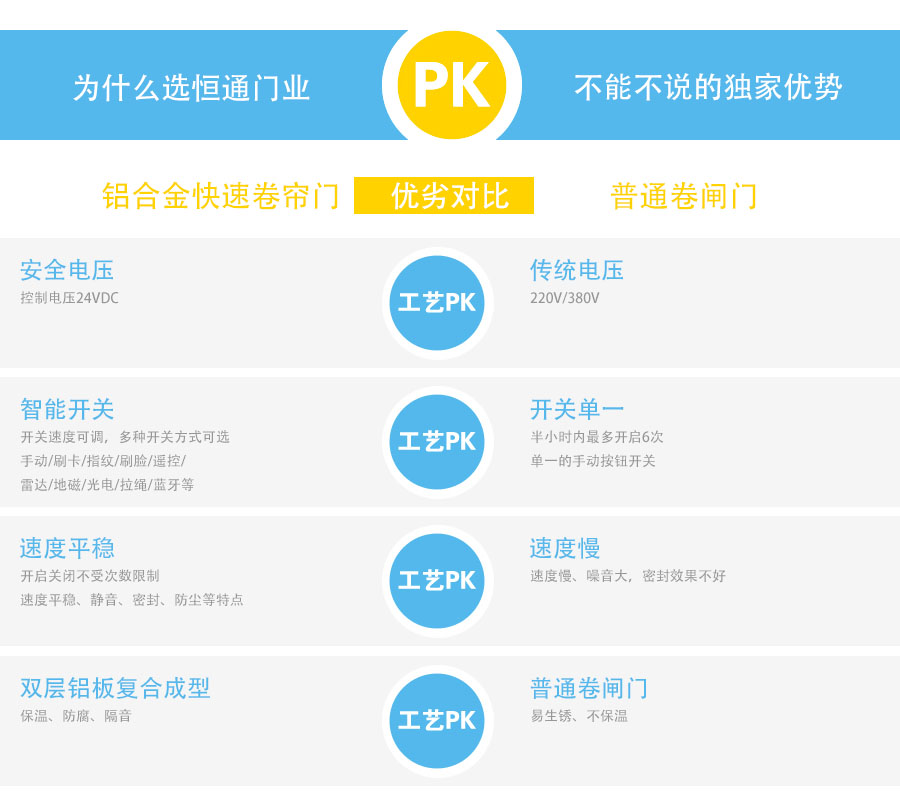 恒通門業(yè)鋁合金快速卷簾門采用鋁合金門體,具有開啟關(guān)閉速度快、抗風、防盜、保溫、隔音、防潮等特點,具備各種自動開啟方式,全方位的滿足您對快速門的使用要求。